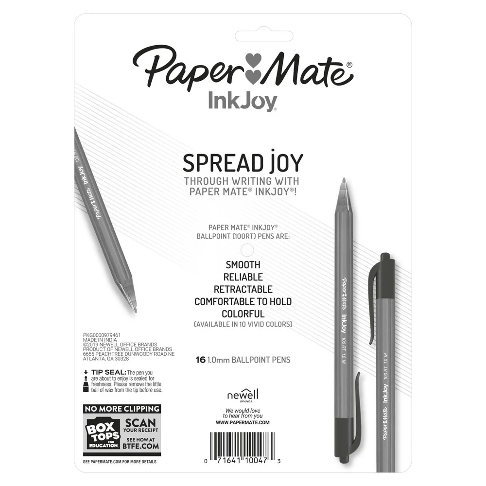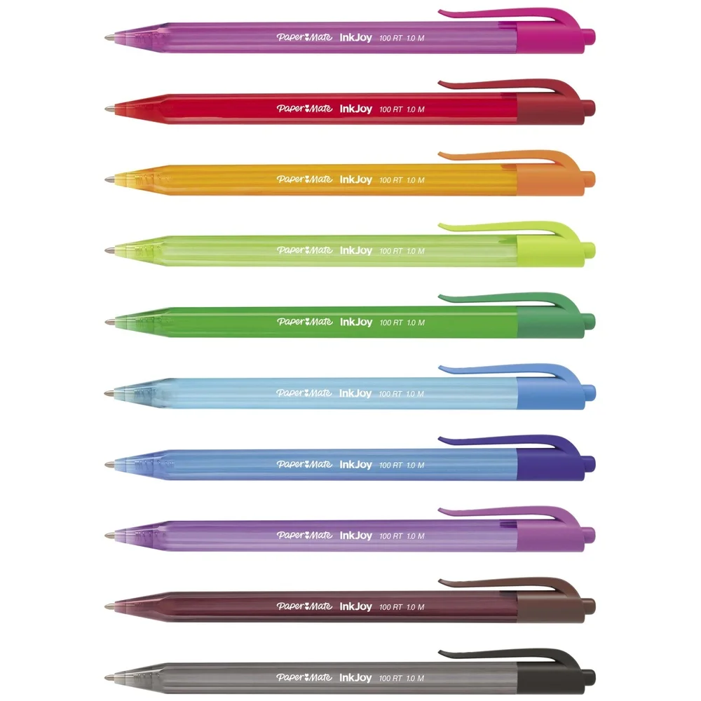 Spread joy with Ink Joy! Paper Mate InkJoy 100 Ballpoint Retractable Pens have a smooth, fast-starting writing system that spreads ink easily so writing’s never a drag. At work and at school, you can enjoy rich assorted ink that flows from these ballpoint pens as freely as your thoughts. Brighten up every page and make writing more fun with Paper Mate InkJoy ballpoint colored pens.