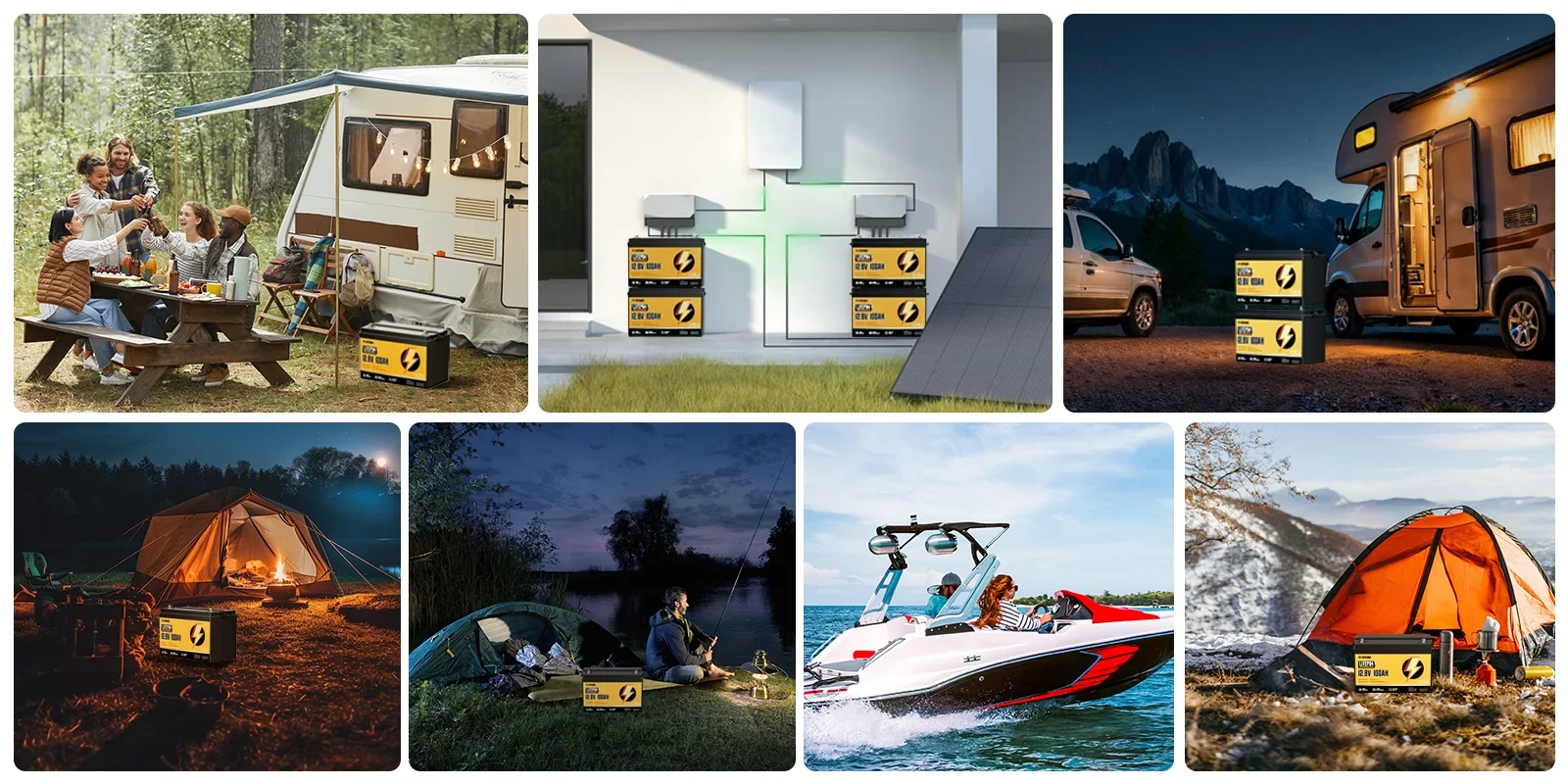 Covers home energy storage systems, solar/wind energy storage solutions, RV/camping vehicle power supply, off-grid residential electricity, marine/yacht auxiliary power, UPS backup power, various lighting equipment, portable TVs, electronic robots, fish finders, electric motors, travel trailers, and more—meeting core low-voltage power supply needs.
